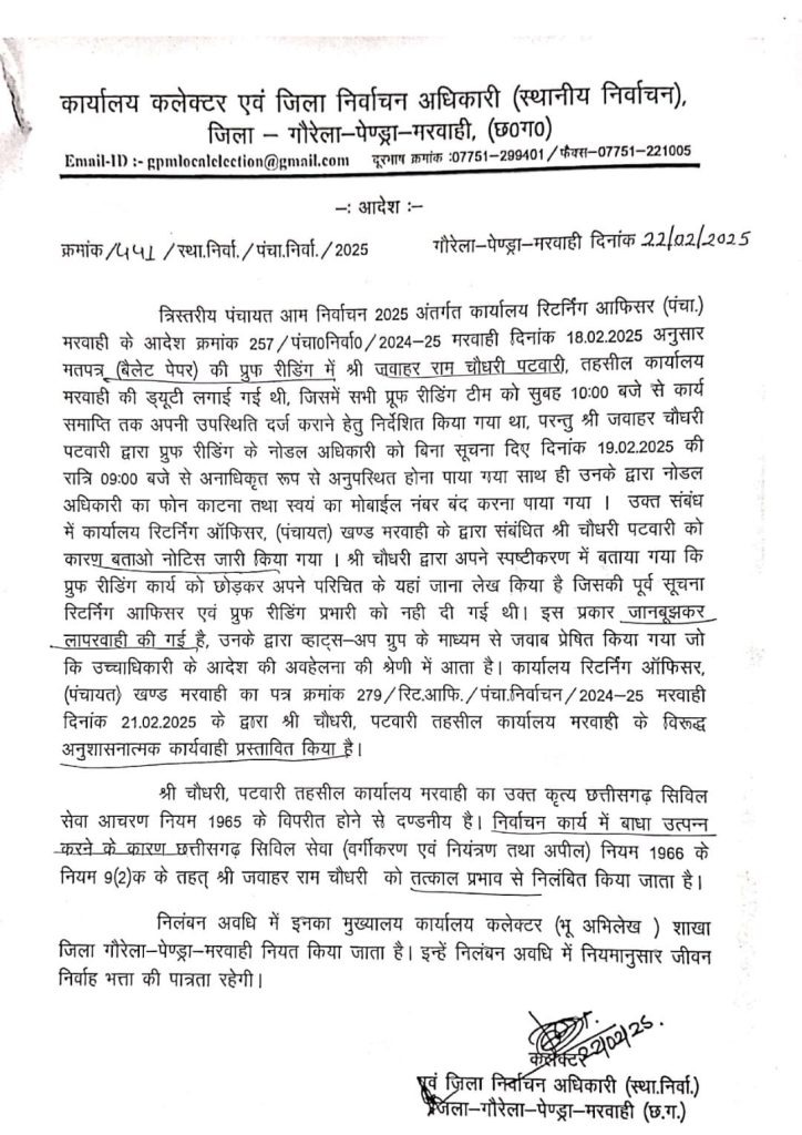 कलेक्टर एवं जिला निर्वाचन अधिकारी (स्थानीय निर्वाचन) गोरेला-पेंड्रा-मरवाही ने इस गंभीर अनुशासनहीनता को ध्यान में रखते हुए छत्तीसगढ़ सिविल सेवा (वर्गीकरण, नियंत्रण एवं अपील) नियम 1966 के नियम 9(2)क के तहत तत्काल प्रभाव से पटवारी जवाहर राम चौधरी को निलंबित करने का आदेश जारी किया।