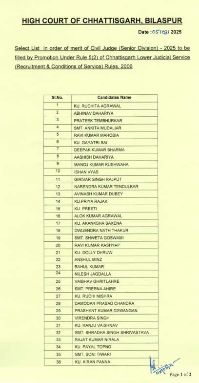 CG Judge Promotion: छत्तीसगढ़ हाई कोर्ट (High Court) ने प्रदेश के 56 न्यायाधीशों को सिविल जज (सीनियर डिवीजन) के पद पर पदोन्नत किया है। यह पदोन्नति छत्तीसगढ़ लोअर ज्यूडिशियल सर्विस (Chhattisgarh Lower Judicial Service) रूल्स 2006 के अनुसार की गई है।