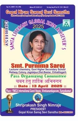 13 अप्रैल कन्याकुमारी के इस भव्य कार्यक्रम में छत्तीसगढ़ से पूर्णिमा सरोज को नॉमिनेशन करने का अवसर मिला। शिक्षा , साहित्य , संस्कृति तथा विभिन्न सामाजिक कार्यों में सक्रियता हेतु गोपाल किरण समाजसेवी संस्था के योग्य निर्णायक मंडल द्वारा चयनित देश के प्रथम 50 नॉमिनेशन में पूर्णिमा सरोज को स्थान मिला है। अत्यंत हर्ष का विषय है कि आज उन्हें लिटररी ग्लोबल आइकन अचीवर्स अवॉर्ड 2025 से सम्मानित किया जाएगा।