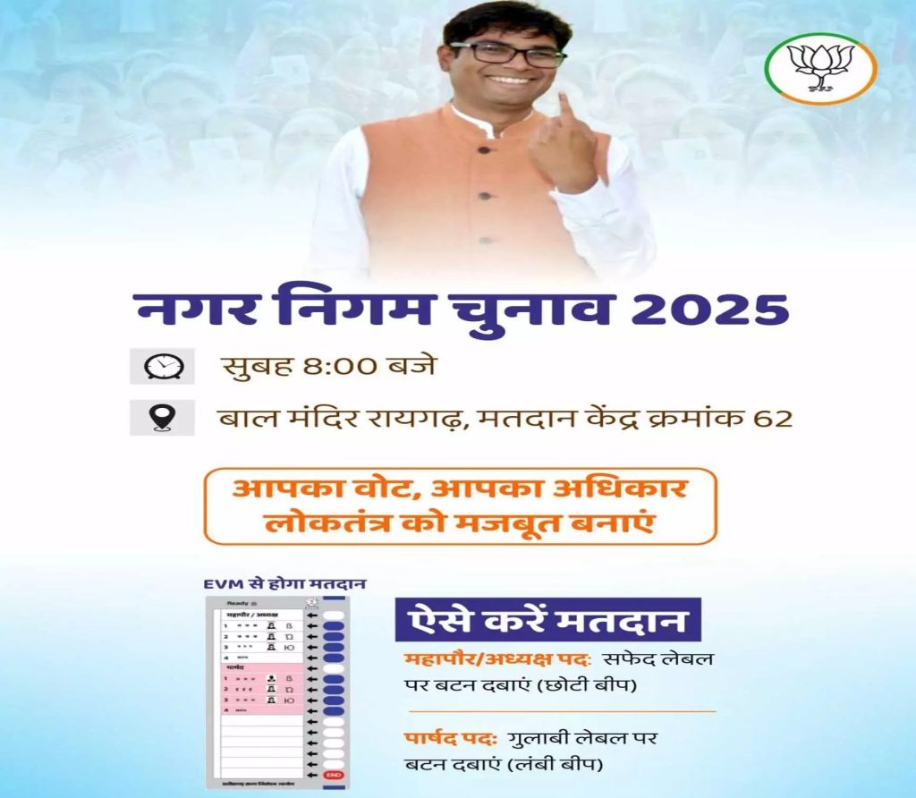 Raigarh. रायगढ़। रायगढ़ नगर निगम चुनाव के लिए बाल मंदिर, रायगढ़ मतदान केंद्र क्रमांक 62 में सुबह 8.00 बजे मताधिकार का उपयोग करूंगा। अपने वोट से लोकतंत्र को मजबूत बनाएं और अपने अधिकार का उपयोग नगर के विकास के लिए करें।