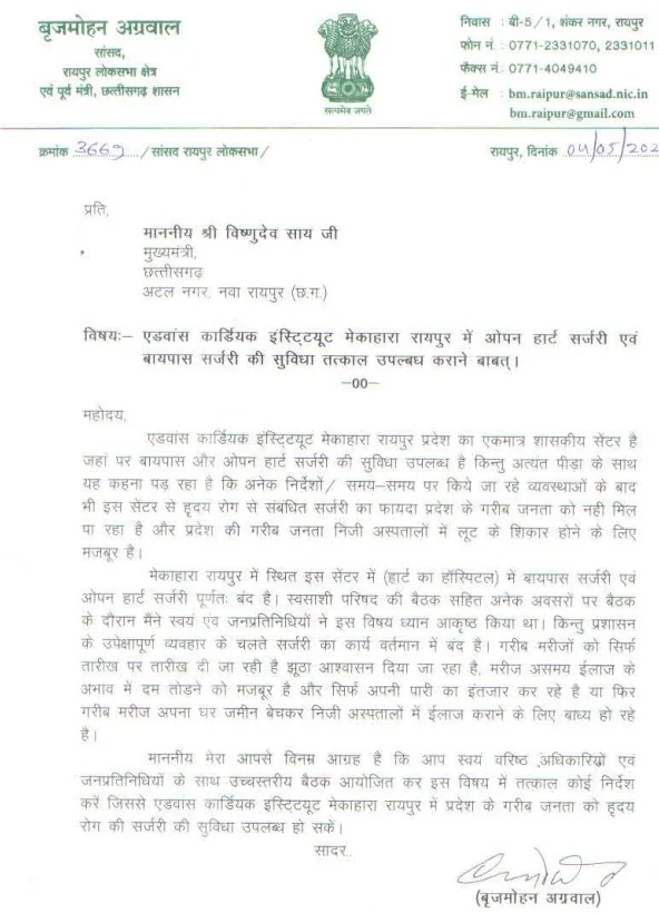 बृजमोहन अग्रवाल ने अपने पहले पत्र में मुख्यमंत्री विष्णुदेव साय और स्वास्थ्य मंत्री श्याम बिहारी जायसवाल से आग्रह किया है कि मेकाहारा रायपुर के एडवांस कार्डियक इंस्टिट्यूट में बंद पड़ी बायपास और ओपन हार्ट सर्जरी सेवाओं को तुरंत बहाल किया जाए।