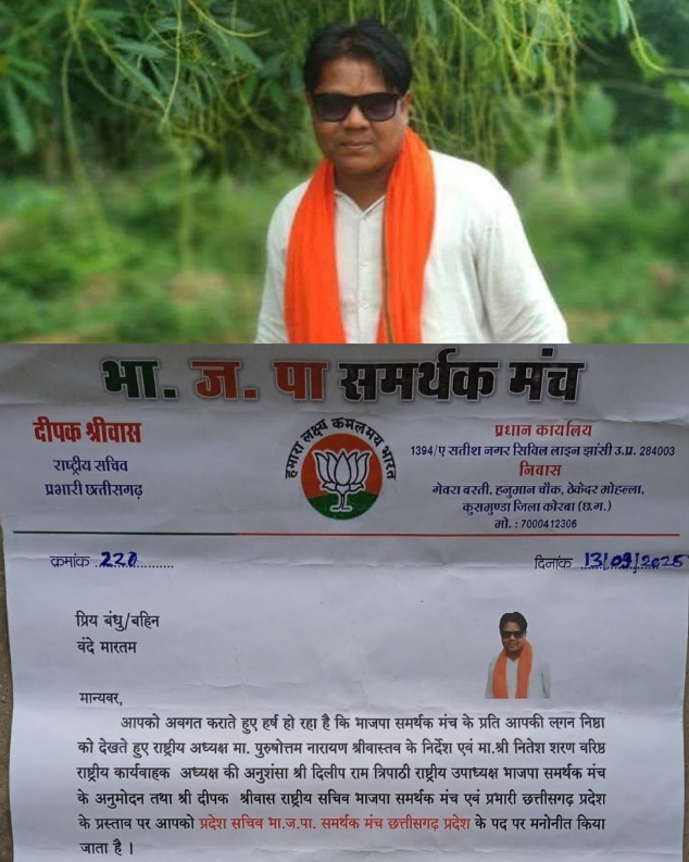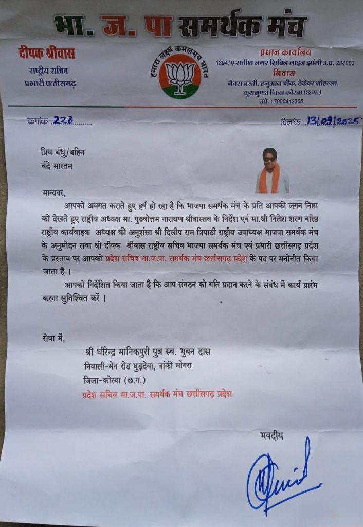 कोरबा, 13 सितम्बर 2025। भाजपा समर्थक मंच ने संगठन विस्तार की दिशा में एक अहम कदम उठाते हुए छत्तीसगढ़ प्रदेश में नई नियुक्ति की है। संगठन के राष्ट्रीय सचिव व प्रदेश प्रभारी दीपक श्रीवास्तव के अनुमोदन पर घुड़देवा बाकी मोगरा के रहने वाले धीरेंद्र मानिकपुरी को प्रदेश सचिव, भाजपा समर्थक मंच छत्तीसगढ़ की जिम्मेदारी सौंपी गई है।