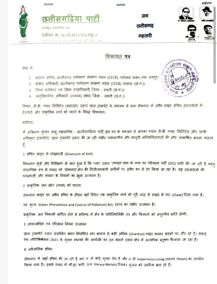 सक्ती जिले में छत्तीसगढ़िया पार्टी के महासचिव अविनाश कुमार साहु ने इस मामले में प्रेस विज्ञप्ति जारी करते हुए कई गंभीर आरोप लगाए हैं। अविनाश कुमार साहु ने प्रेस विज्ञप्ति में दावा करते हुए कहा है कि इस मामले में एसईसीएल छाल उपक्षेत्र, डीबी पावर प्लांट और ट्रांसपोर्टर के द्वारा किए जा रहे पर्यावरणीय घोटाले का पर्दाफाश किया है। उन्होंने जिला कलेक्टर, पर्यावरण संरक्षण मंडल अधिकारी और एसईसीएल निदेशक को पत्र सौंपकर इस मामले में विधिवत कार्रवाई किए जाने की मांग की है।