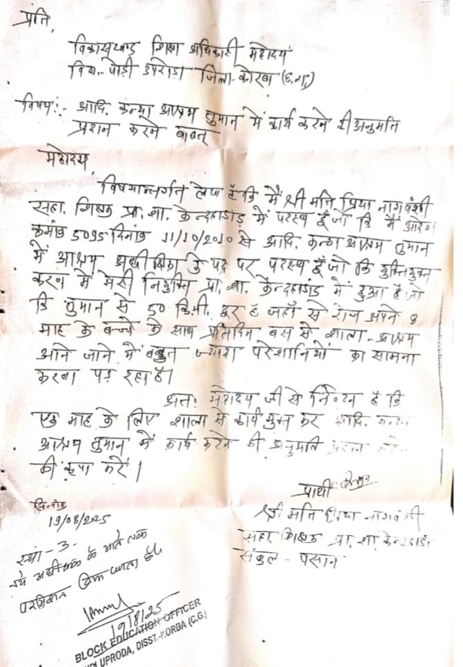 उनके आवेदन में साफ तौर पर लिखा था कि “एक माह के लिए शाला से कार्यमुक्त कर कन्या आश्रम तुमान में ही कार्य करने की अनुमति दी जाए।”